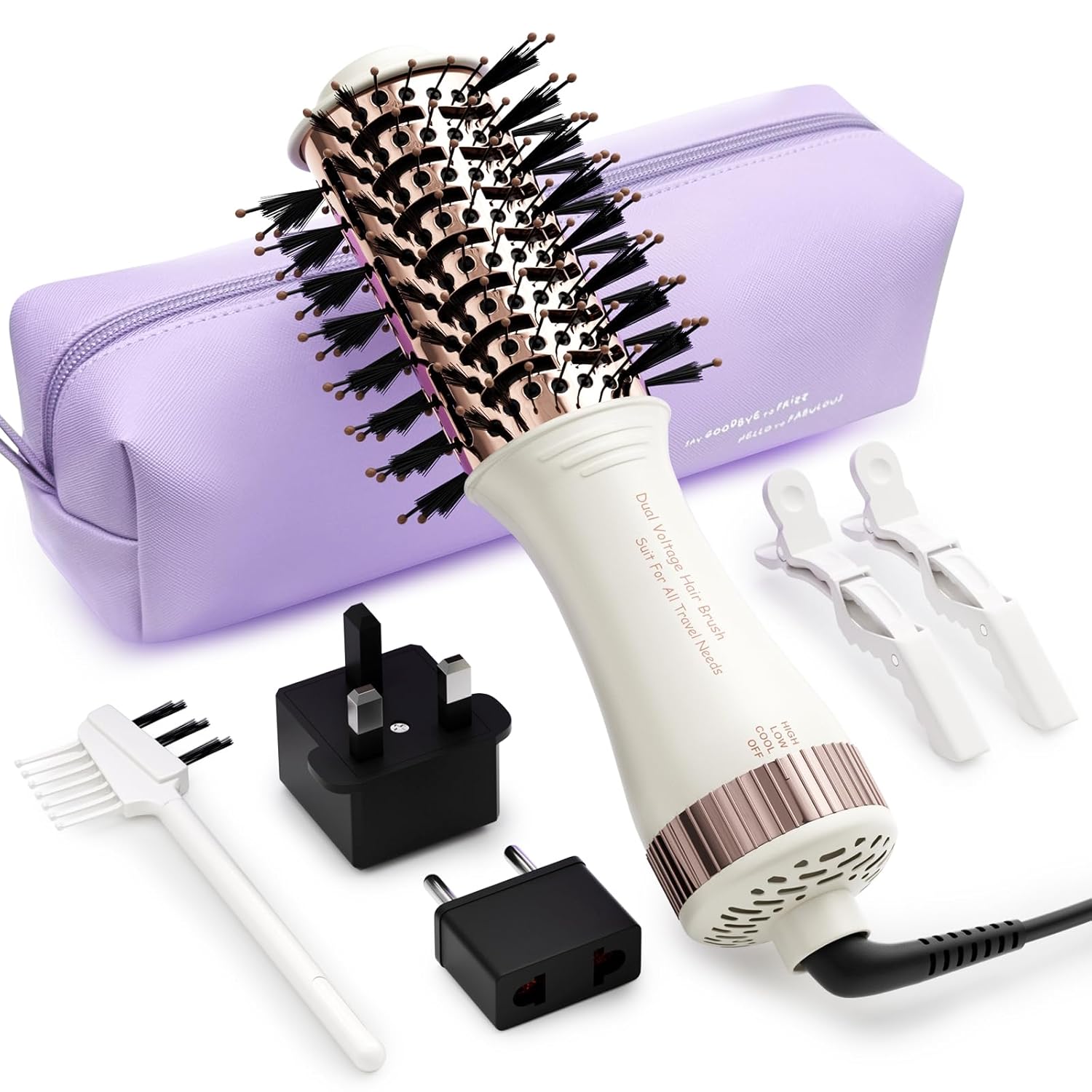 4-in-1 Travel Dual Voltage Hair Dryer Brush Blow Dryer Brush,Portable 2 inch Mini Hot Air Brush,Travel Hair Styler/Volumizer/Straightener/Curler,110-240V European Blow Dry Brush with EU&UK Plug