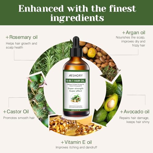 Aeshory Hair Oil - 5 IN 1 Hair Care Oil with Rosemary, Castor, Argan, Vitamin E, and Avocado for Hair Growth and Strengthening - Nourishing and Volumizing 3.38 fl oz