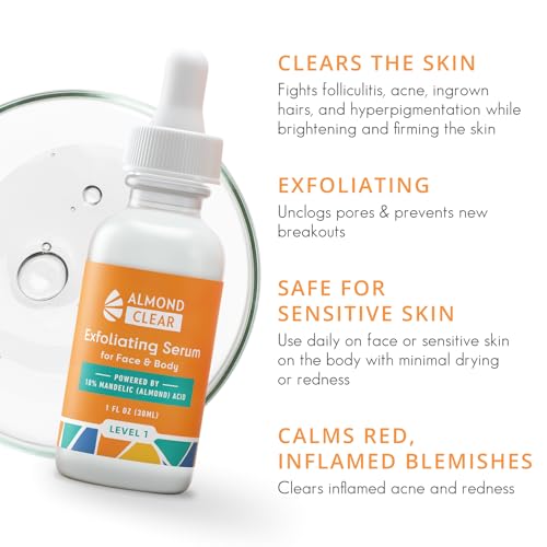 Almond Clear Level 1 Serum | Mandelic Acid Facial Serum for Acne, Folliculitis, Aging Skin, Ingrown Hairs, Dark Spots on Face, Chest, Butt, Back, Thighs, Arms | 4oz