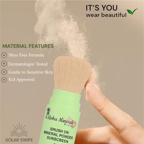 Aloha Minerals Block Brush-On Mineral Powder Sunscreen For Face, SPF 50, Water Resistant, Broad Spectrum, Natural Mineral Blend, Oil Abrosbent, Tropical Scent, Carrot Seed Extract, 0.21oz