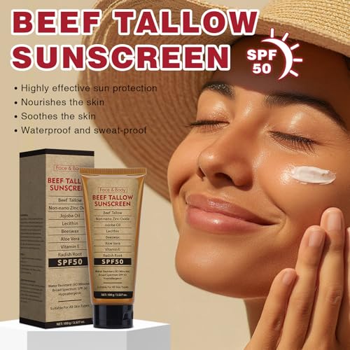 Beef Tallow Sunscreen with Zinc Oxide for Body Facial, Non-Toxic Natural Mineral Sunscreen Reef Safe Sunblock SPF 50,Clean Non-Greasy (For Sport or Daily Use), 3.5 OZ