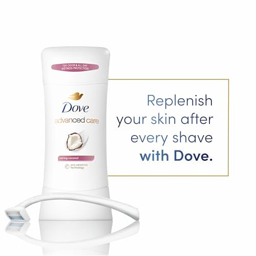 Dove Advanced Care Antiperspirant Deodorant Stick Caring Coconut 4 ct for helping your skin barrier repair after shaving 72-hour odor control and sweat protection with Pro-Ceramide Technology 2.6 oz