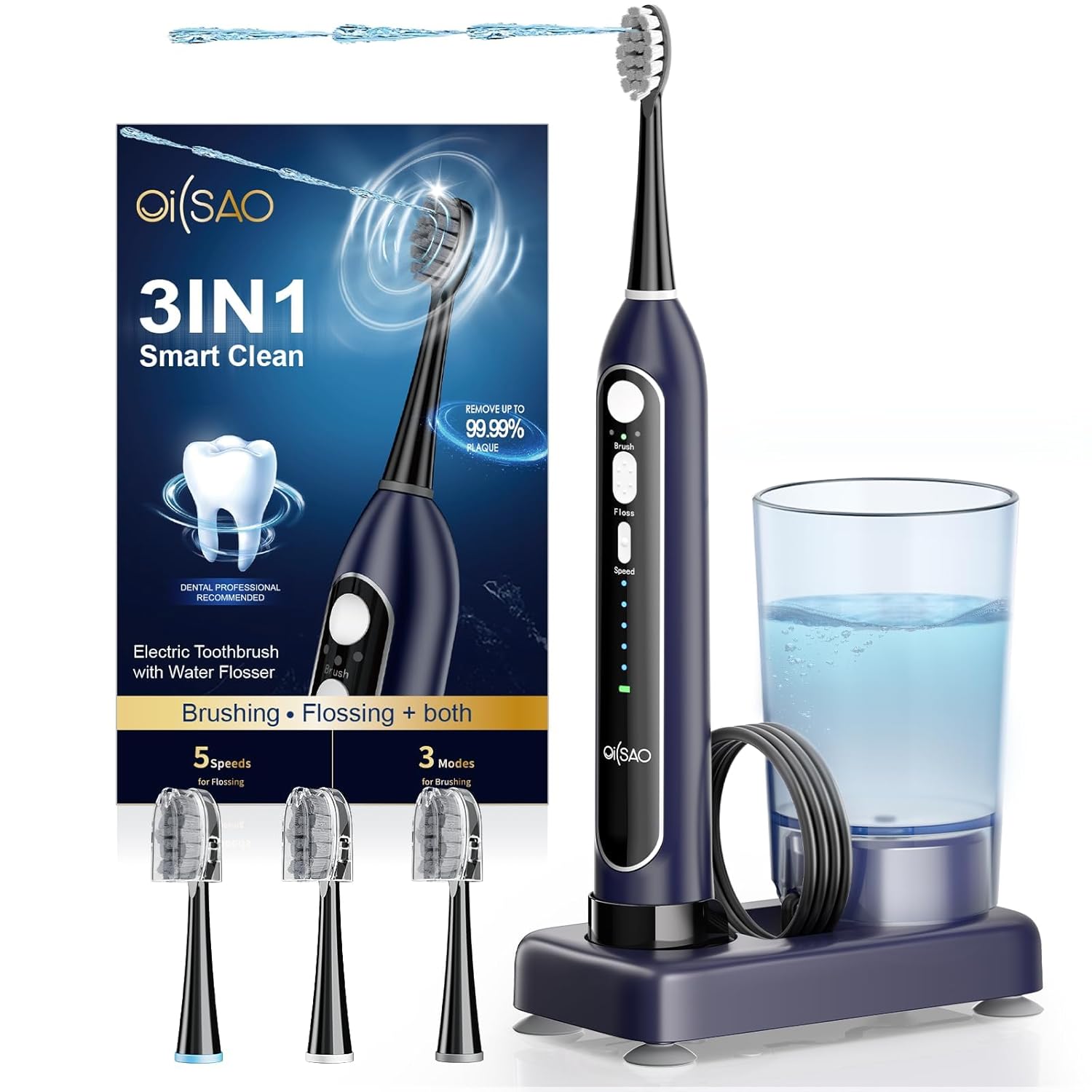 | Special Feature | 3 Brushing Modes, 5 Flossing Speeds,2 min Smart Brushing Timer, 3 Replacement Brush Heads, 3-in-1 Electric toothbrush Flosser Combo for Teeth Cl… See more |