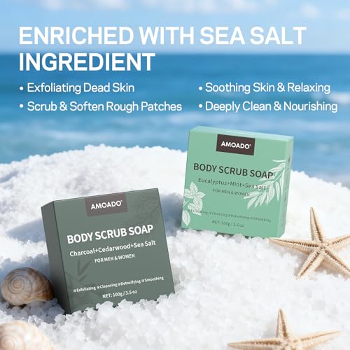Exfoliating Body Scrub Soaps, 2 Pack Eucalyptus+Charcoal Exfoliating Soap Bar for Men & Women - Smooth & Soften Skin, Detoxify, Body Exfoliator Bar with Dead Sea Sand