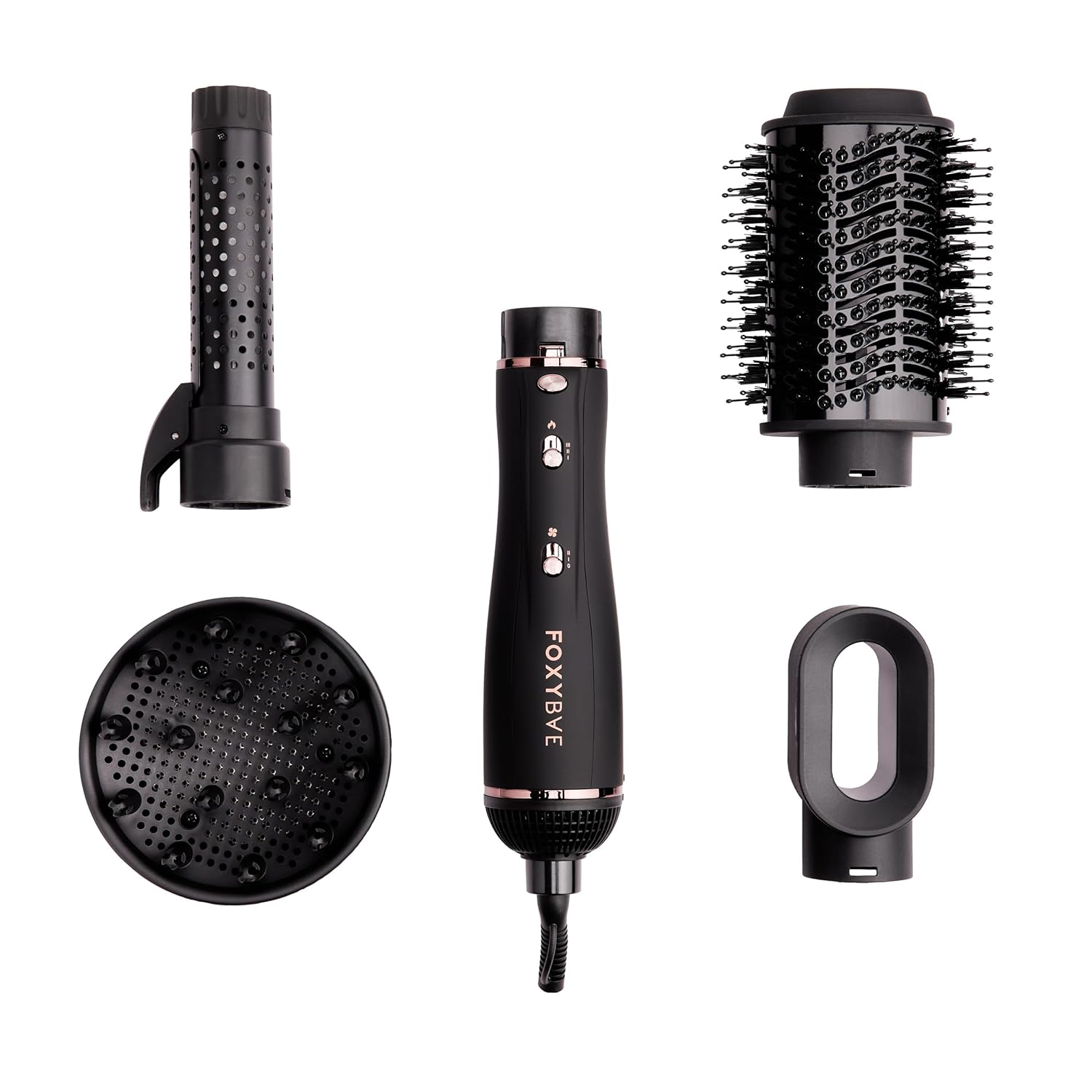 Foxybae Super Styler – 4-in-1 Blow-Dryer Brush Set - Diffuser, Blowout-Brush, 1.25” Curling Barrel & Drying Cylinder - Voluminous, Frizz-Free Hair - Dryer, Straightener & Curler (Black Rose-Gold)