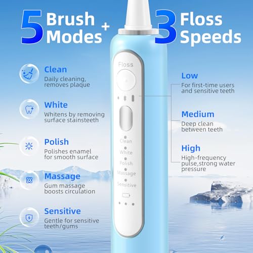 Professional Flossing Electric Toothbrush with Water Flosser, Water Flossers for Teeth 2 in 1 Toothbrush and Water Flosser Combo, Sonic Electric Toothbrush Cordless Flossing Brush (Blue)
