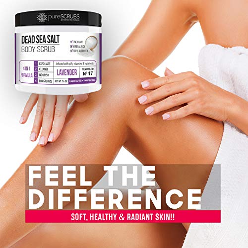 pureSCRUBS Premium Lavender Body Scrub Set - Large 16oz Dead Sea Salt Body Scrub With Infused Essential Oils & Nutrients, Includes Wooden Spoon, Loofah & Oatmeal Exfoliating Bar Soap