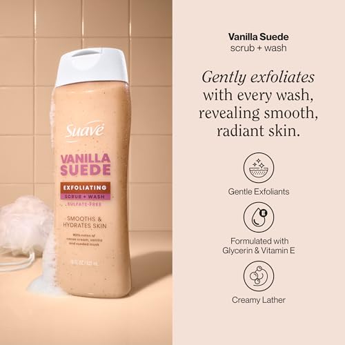 Suave Vanilla Suede Exfoliating Body Wash & Scrub with Glycerin & Vitamin E, Sulfate-Free Hydrating Cleanser for Soft, Smooth Skin, 6 Count, 18 FL OZ EA