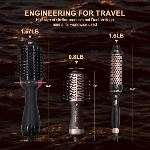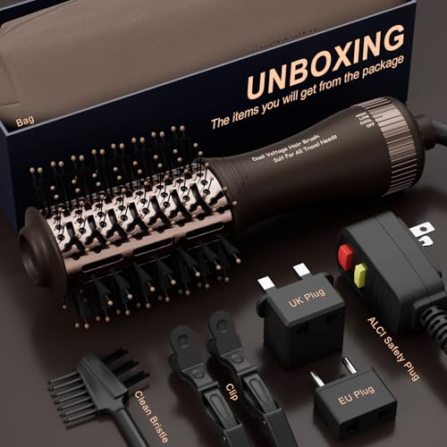 Travel Dual Voltage Hair Dryer Brush 4-in- 1,Portable Mini Hot Air Blow Dryer Straightener & Curler Brush,Titanium Oval Blowout Styler Volumizer Tools-Dark Chocolate