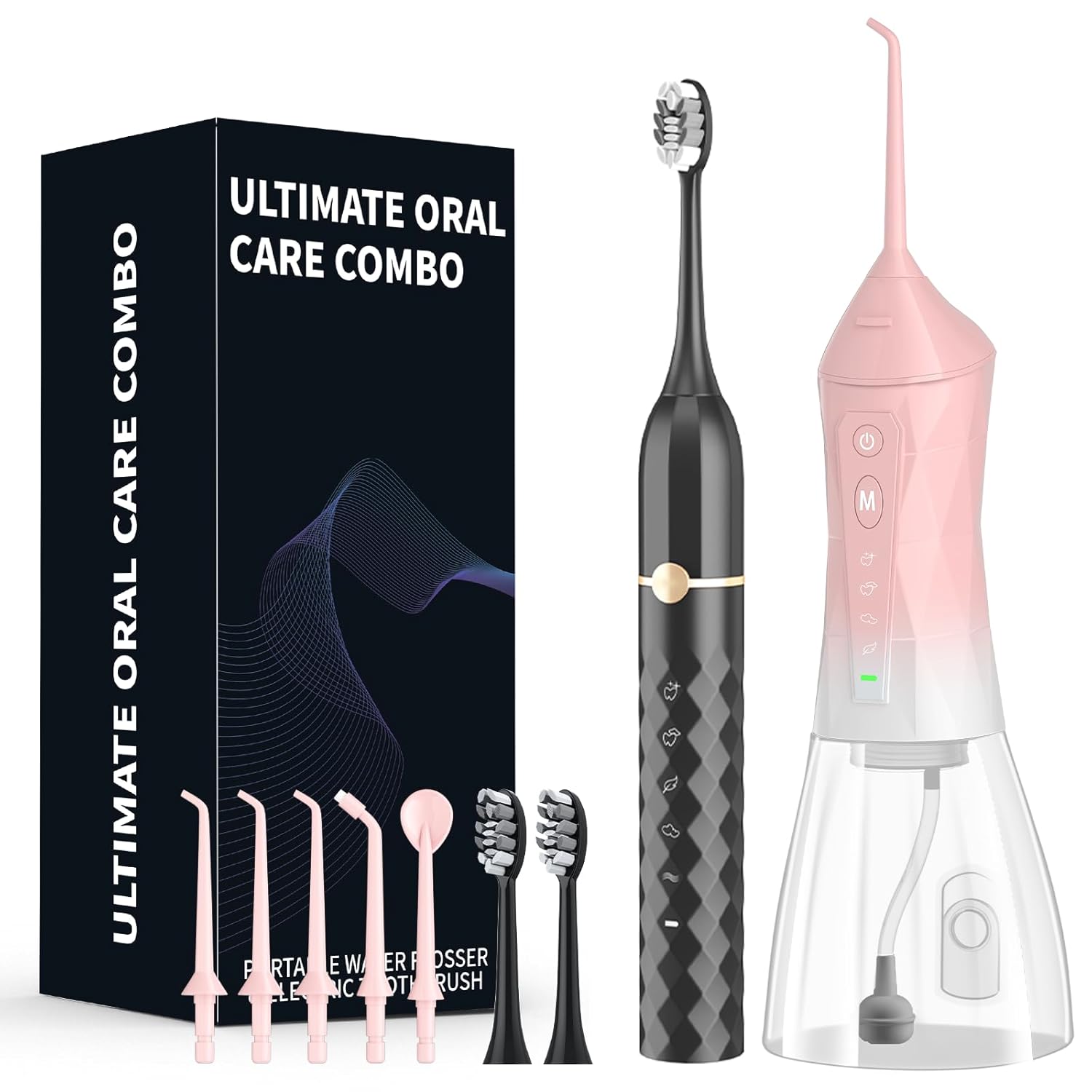Water flosser+Electric Toothbrush Combination Set -5-Speed Sonic Electric Toothbrush, 4-Speed Portable Water flosser, Super Waterproof, a Great Gift for Friends (Pink)
